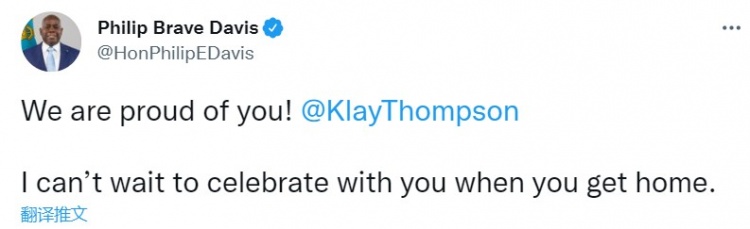 “我们为你骄傲@克莱-汤普森。我已经等不及在你回到家乡时跟你一起庆祝了。”戴维斯写道。