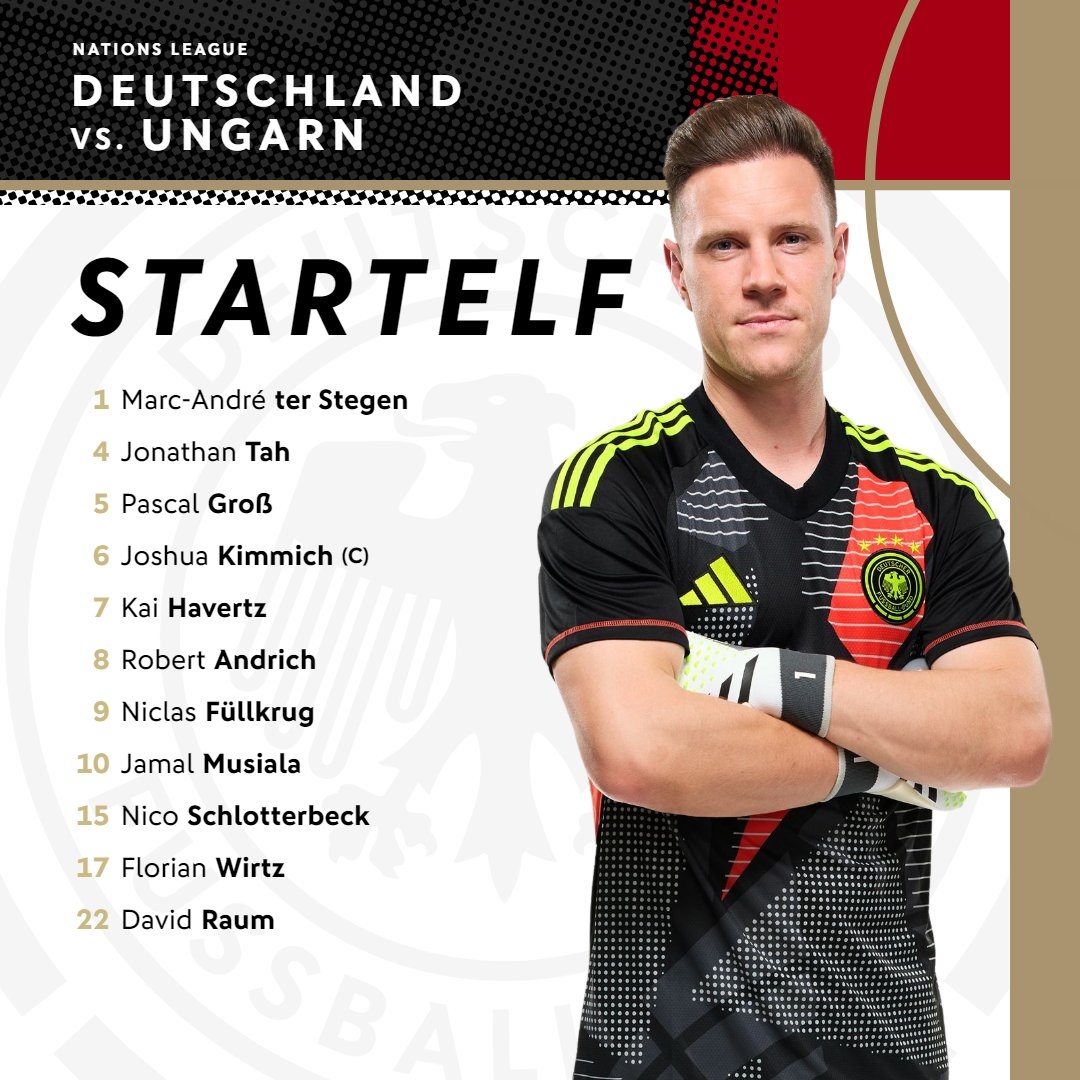 德国vs匈牙利首发:特尔施特根先发,基米希、哈弗茨、维尔茨出战