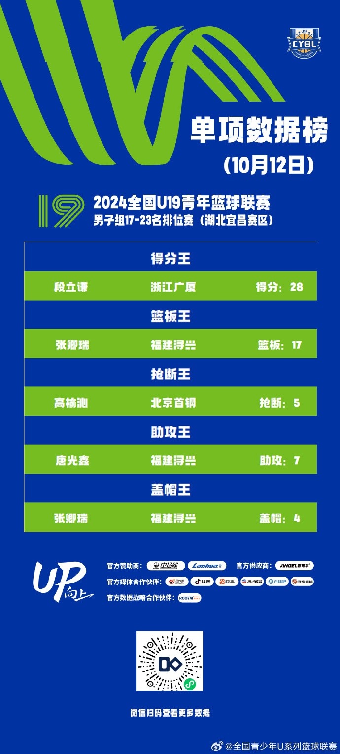 【单项数据榜】2024年全国U19青年篮球联赛男子组第二阶段17-23名排位赛(湖北宜昌赛区)(10月6日-12日)单项数据王名单⬇️