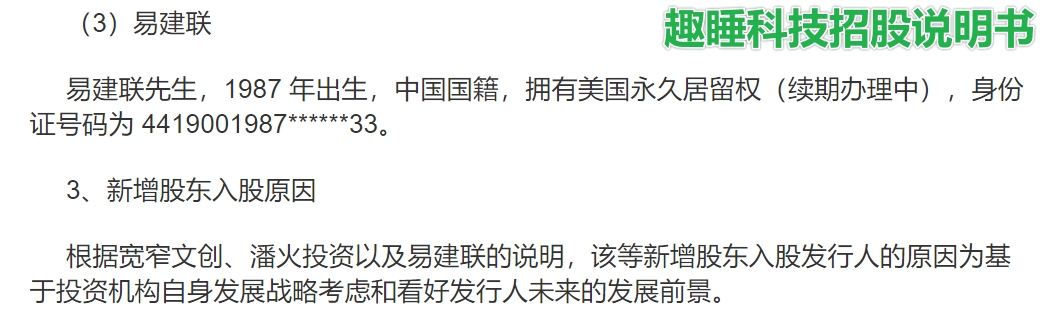 易建联事件中所曝光的身份证号码,与趣睡科技招股说明书(2022年7月29日)中所显示的易建联部分身份证号一致,