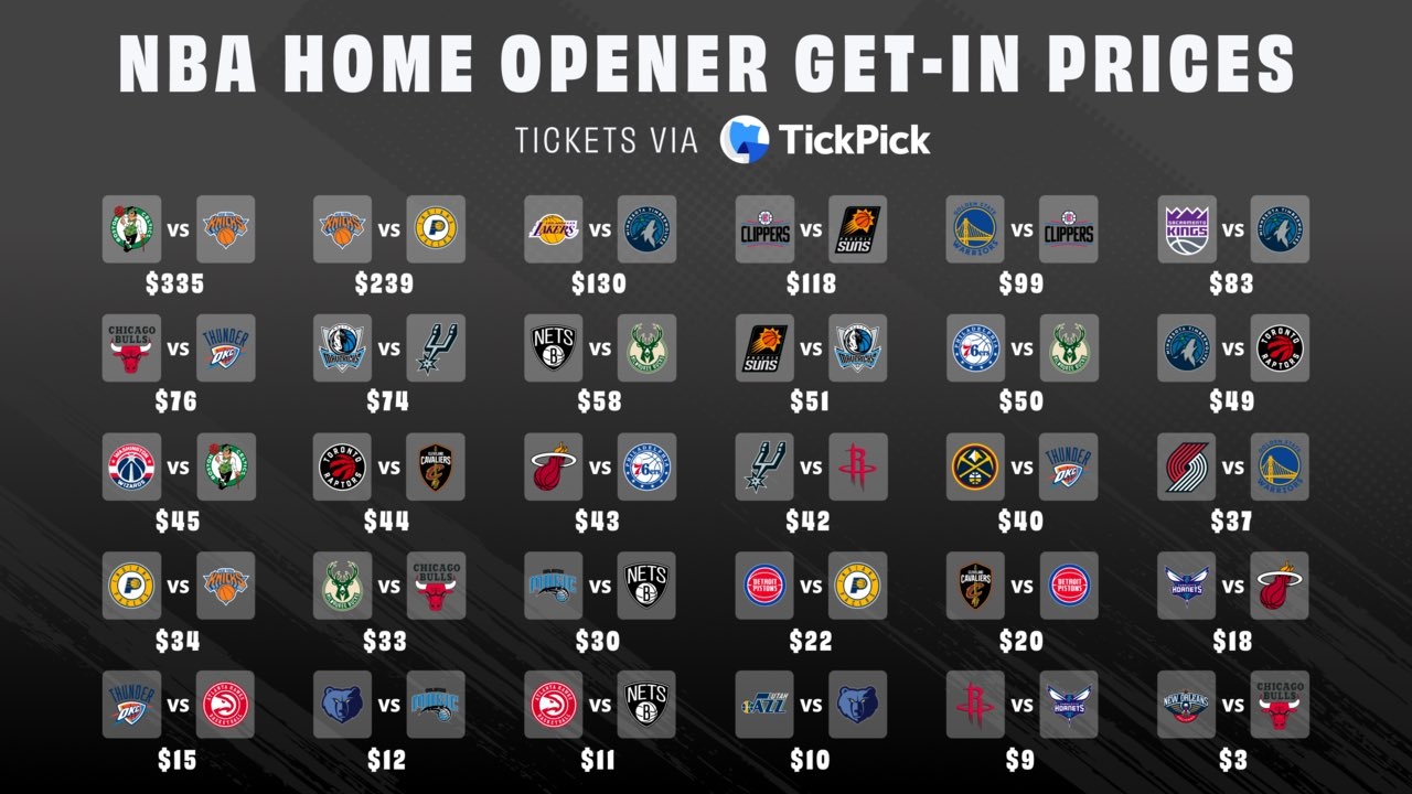 10月18日讯 今日,美媒NBACentral晒出新赛季揭幕战TickPick平台各队的入门票价(最低票价):