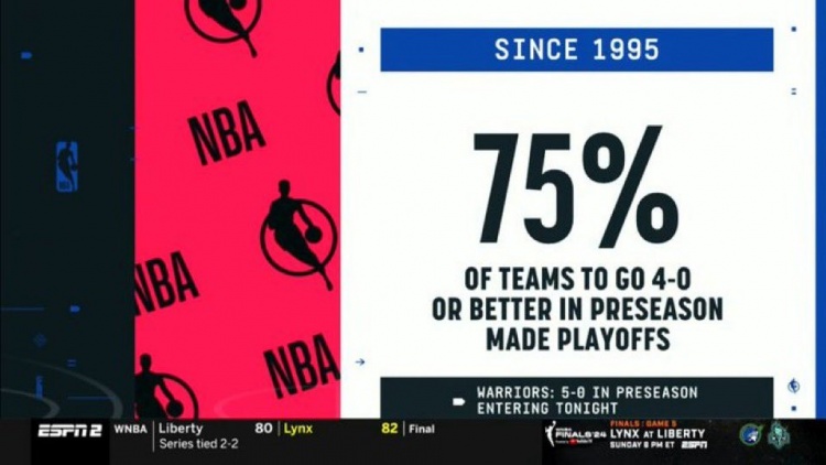 比赛期间,转播方晒出一项数据:在季前赛中取得4胜0负或更好战绩的球队,75%都打进了当年的季后赛。