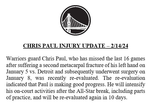 文章写道:“保罗在1月5日(当地时间)对阵活塞的比赛中左手第二掌骨骨折,随后在1月8日接受了手术。保罗近期重新接受了评估,结果显示保罗恢复良好。全明星赛后保罗将加强场地恢复,包括进行部分训练,并在10天后再次接受评估。”
