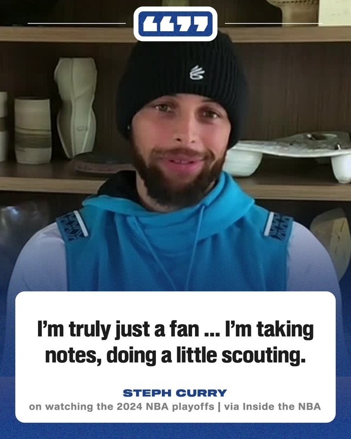 库里在TNT直播节目中透露自己正在密切关注季后赛,库里表示:“我现在是个正儿八经球迷,我会边看比赛边做点笔记,干点球探的活儿。”