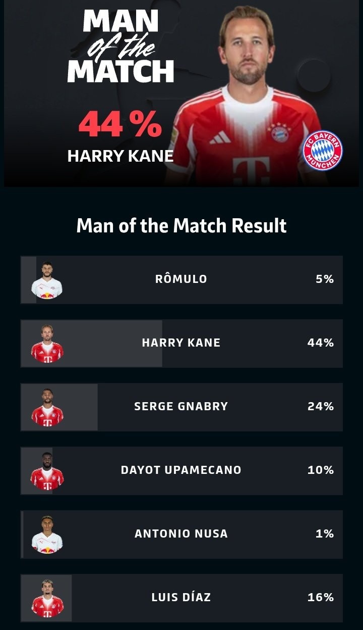 凯恩在本场比赛打进1球,获得了44%的得票率。值得一提的是,替补独造4球的奥利塞并未进入候选名单。