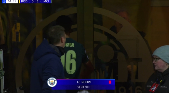 01月21日讯 欧冠联赛阶段第7轮,曼城客战博德闪耀。61分钟,罗德里1分钟连吃2黄,被罚下。