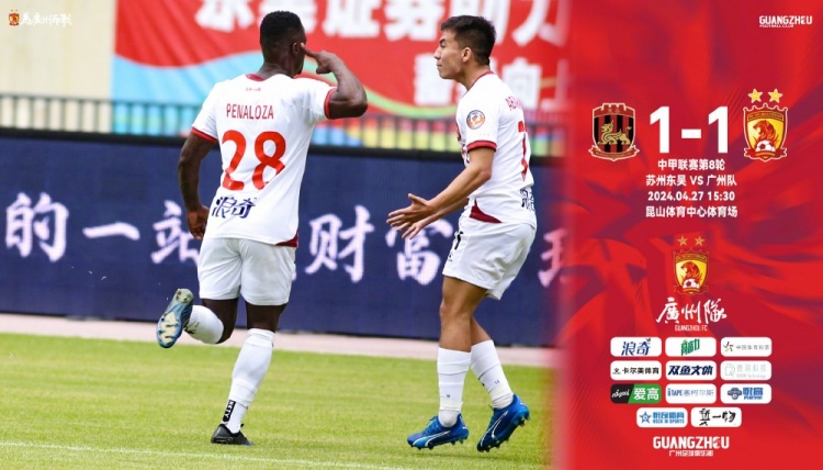 【浪奇撑广州】4月27日,中甲联赛第8轮广州队客场对战苏州东吴。上半场贝尼亚罗萨抽射破门打进广州生涯首球,比分1-0领先苏州东吴。苏州队外援莱昂纳多在半场补时阶段扳平比分,半场结束,广州队1-1苏州东吴。下半场双方互有攻守并未创造出太多机会,全场比赛结束广州队1-1与苏州东吴战平。