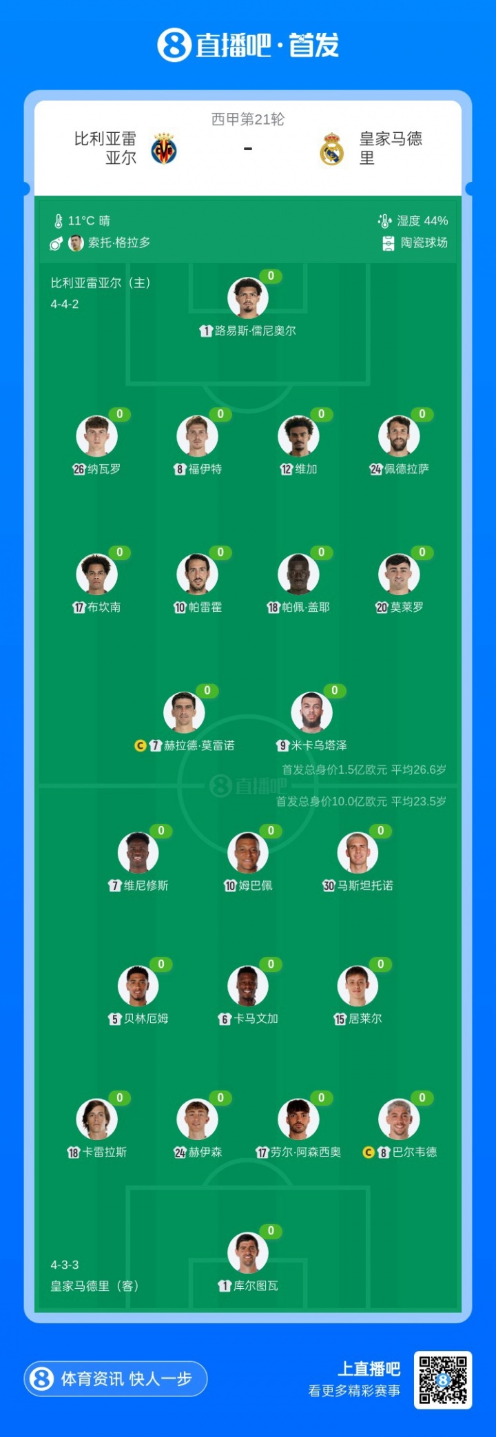 皇马首发:1-库尔图瓦、8-巴尔韦德、17-劳尔·阿森西奥、24-赫伊森、18-卡雷拉斯、15-居莱尔、6-卡马文加、5-贝林厄姆、30-马斯坦托诺、7-维尼修斯、10-姆巴佩