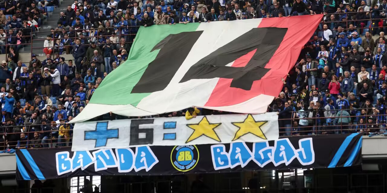 本赛季国米提前5轮夺得意甲冠军,这是国米队史的第20次冠军,他们可以在球衣上绣上两颗星星。而本轮在国米主场对都灵的意甲联赛中,国米球迷却挂着一面旗帜,上面写着国米第14次意甲冠军,下方则写着一排小字:+6=两颗星。