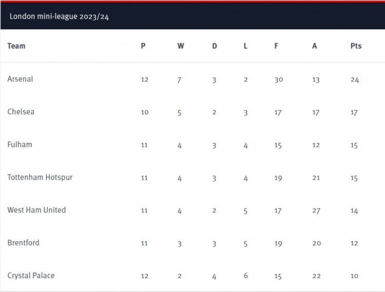 5月1日讯 在英超第35轮北伦敦德比中,阿森纳客场3-2击败热刺。本场比赛是枪手本赛季最后一场伦敦球队内战,阿森纳官方也晒出了伦敦德比积分榜,12轮拿到24分的枪手已经提前锁定了本赛季伦敦德比积分榜榜首。