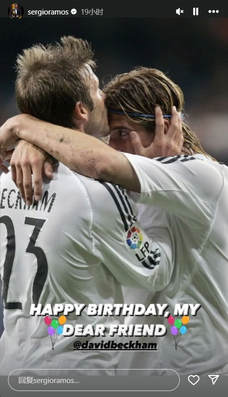 拉莫斯在社交媒体上晒出自己与贝克汉姆效力皇马时期的合照,并配文:“生日快乐,我亲爱的朋友。”