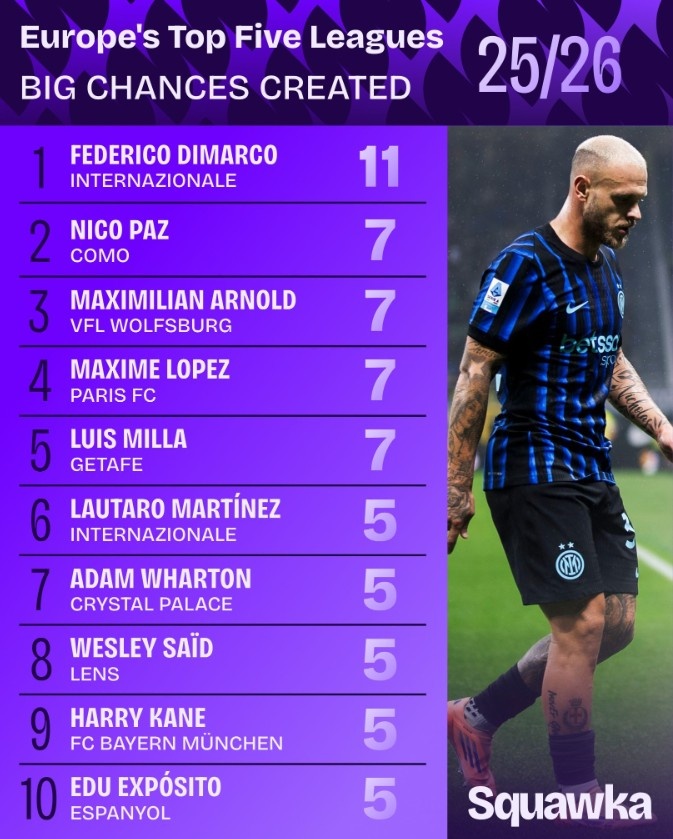 10月17日讯 本周末,欧洲五大联赛将重燃战火。Squawka盘点了本赛季五大联赛创造重大机会情况,其中迪马尔科以11次居首,尼科-帕斯等4人均7次紧随其后。