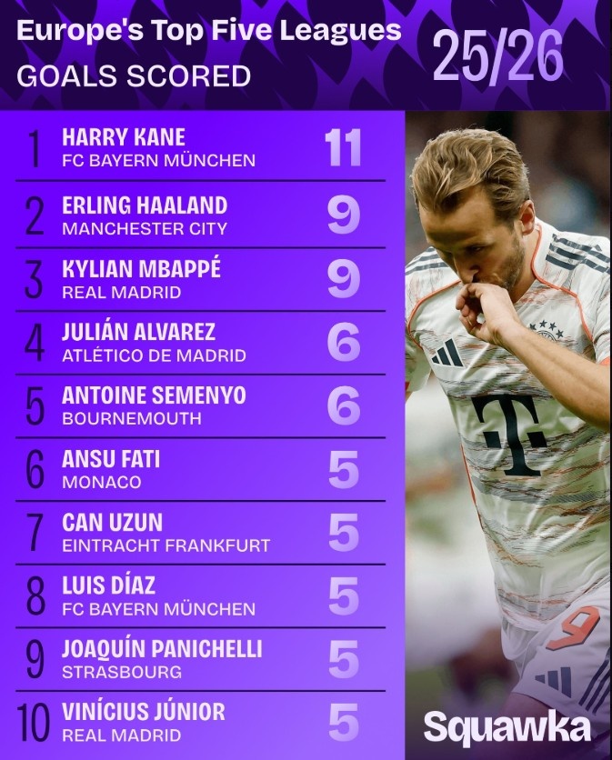 10月17日讯 本周末,欧洲五大联赛将重燃战火。Squawka盘点了本赛季迄今为止五大联赛进球数情况,凯恩以11球居首,哈兰德和姆巴佩均打进9球紧随其后。