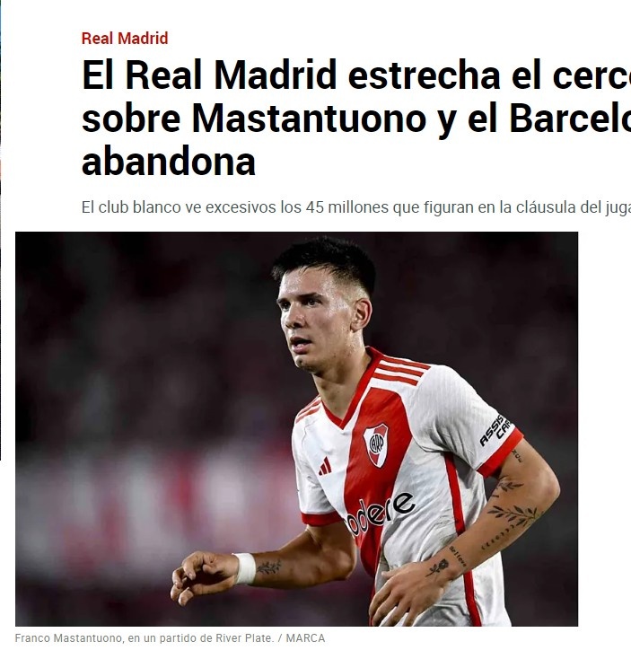 不过,皇家马德里认为马斯坦托诺的合同年限过长,因此试图缩短合同年限,让他有可能在河床效力到2025-26赛季。据《每日体育报》报道,巴塞罗那也对马斯坦托诺感兴趣,但他们已经放弃了争夺。