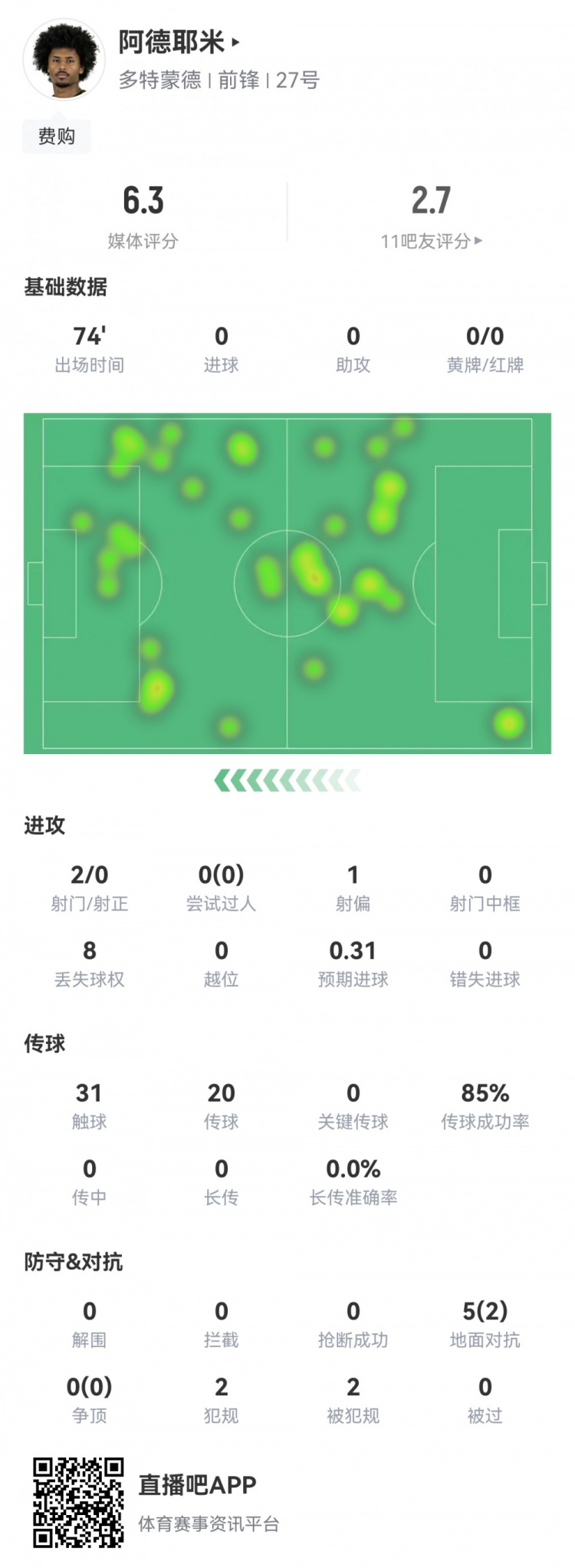 10月19日讯 本轮德甲焦点战,拜仁主场2-1多特。此役阿德耶米首发74分钟被换下,球员全场重点数据如下↓