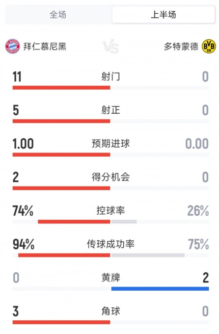 上半场,多特0脚打门,拜仁11射5正。预期进球数拜仁0.78领先多特,控球率拜仁74%领先多特26%。