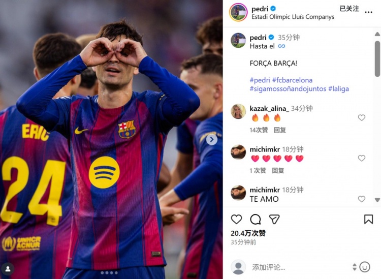 本场比赛佩德里打进精彩进球,赛后他也在社媒晒出庆祝进球照片,配文写道:“直到最后,加油巴萨!”