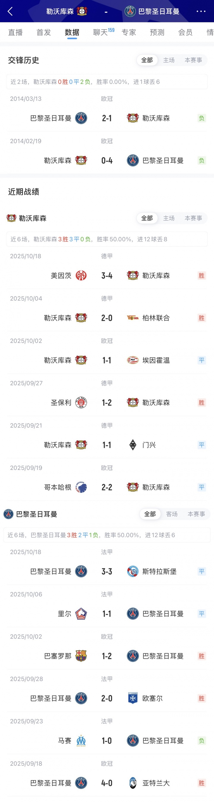 目前勒沃库森遭遇欧冠两连平(2-2哥本哈根、1-1埃因霍温),巴黎圣日耳曼则是2连胜(4-0亚特兰大、2-1巴萨)!