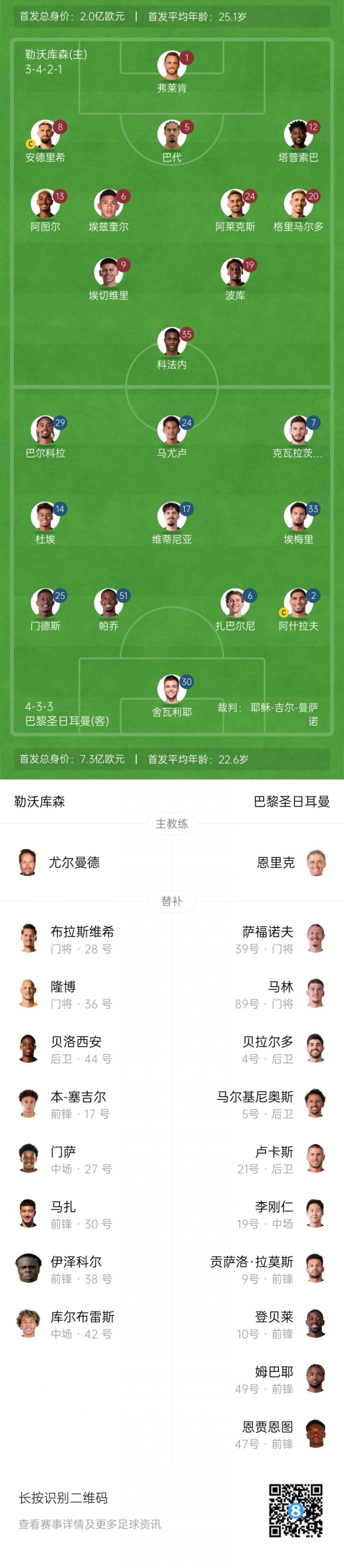 巴黎首发:30-舍瓦利耶、2-阿什拉夫、6-扎巴尔尼、25-努诺·门德斯、51-帕乔、17-维蒂尼亚、24-马尤卢、33-扎伊尔·埃梅里、7-克瓦拉茨赫利亚、14-杜埃、29-巴尔科拉