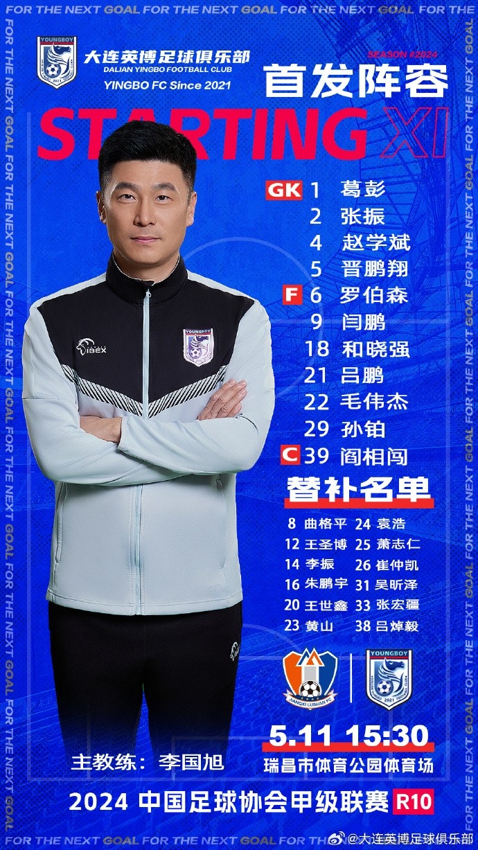 5月11日讯 今天下午15:30,大连英博将在中甲第10轮客场对阵江西庐山,目前大连英博首发名单已经公布。