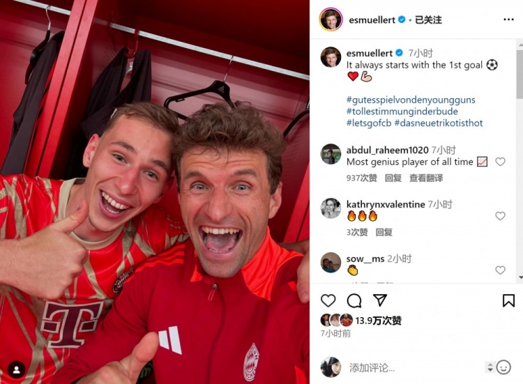 赛后穆勒在社交媒体上晒出与兹沃纳雷克的合照,两人竖起大拇指,穆勒写道:“一切总是从第一个进球开始。”鼓励这位小将继续前进。