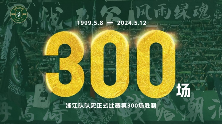 5月13日讯 中超联赛第11轮,浙江队客场1-0击败沧州雄狮。据浙江足球俱乐部官方统计,这是浙江队队史正式比赛第300场胜利。