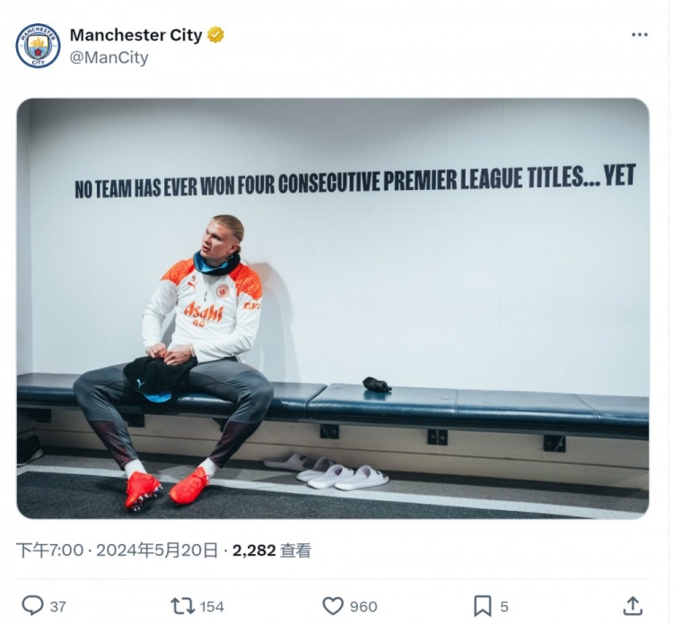 已达成!曼城晒更衣室标语:从没有球队连续赢得4次英超冠军