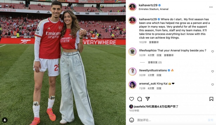 5月20日讯 哈弗茨社交媒体发文,总结自己在阿森纳的第一个赛季。