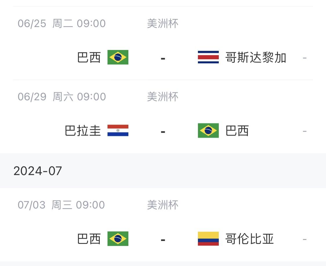 巴西在美洲杯开始前将先和墨西哥以及美国进行热身赛,比赛时间分别是6月8日和6月12日。在美洲杯中,巴西首战对阵哥斯达黎加,第二战对阵巴拉圭,第三战对阵哥伦比亚。
