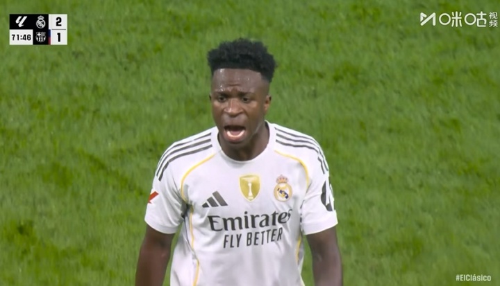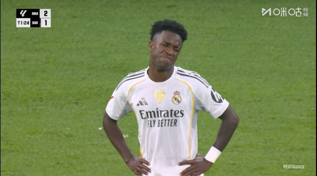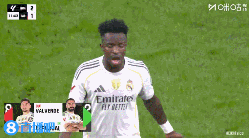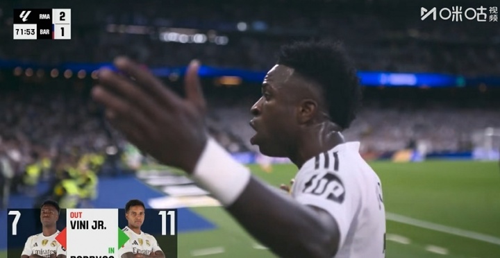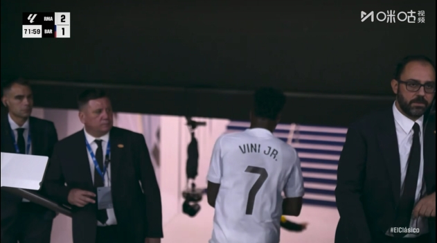 10月27日讯 西甲第10轮西班牙国家德比皇马主场迎战巴萨,第71分钟,维尼修斯被换下,一路喋喋不休,下场径直回更衣室。皇马换上罗德里戈。随后转播镜头显示,维尼修斯又回到了替补席!