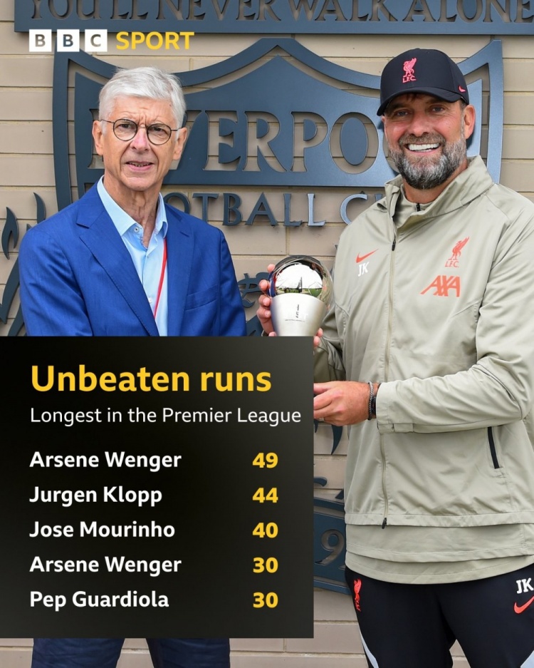 英超教练连续不败场次榜:温格49场居首,克洛普44场次席
