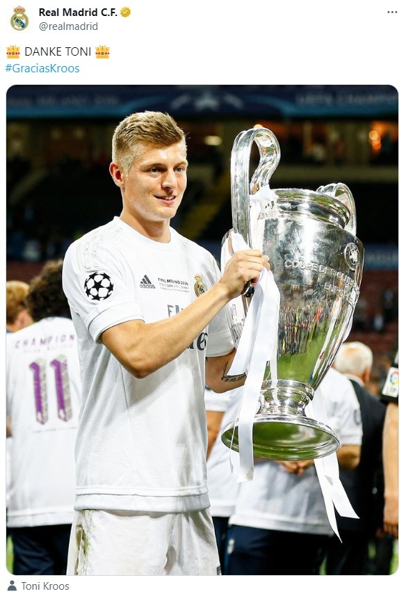 5月21日讯 34岁克罗斯自宣将在欧洲杯后退役,队友维尼修斯发文致敬。