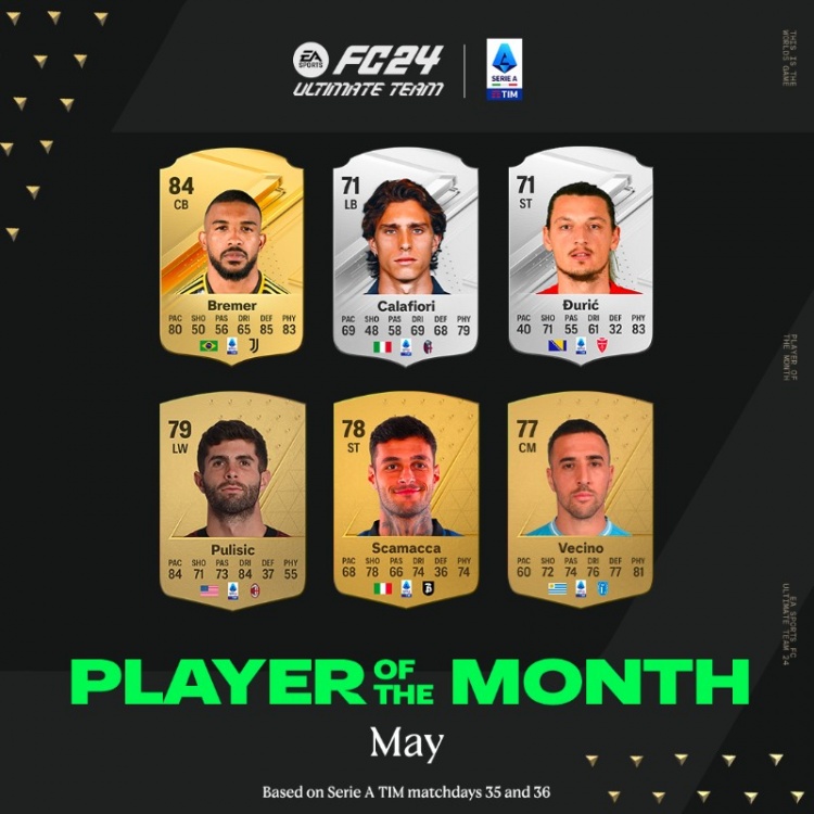 5月21日讯 意甲官方公布了5月份最佳球员的候选名单,布雷默、普利西奇、斯卡马卡在列。