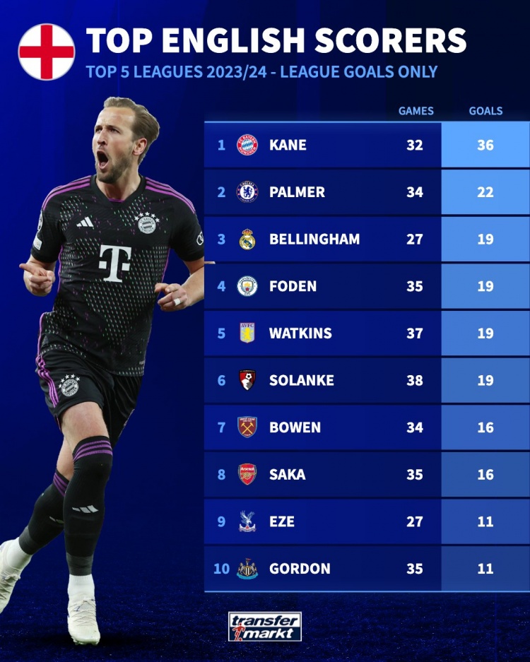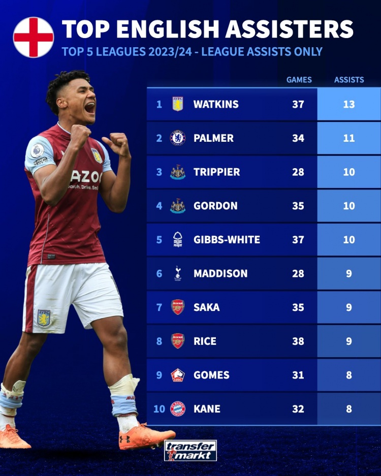凯恩打进36球,沃特金斯助攻13次,皮克福德、塔尔科夫斯基、本-怀特帮助球队完成13场零封,分别占据英格兰球员进球榜、助攻榜、零封榜首位。
