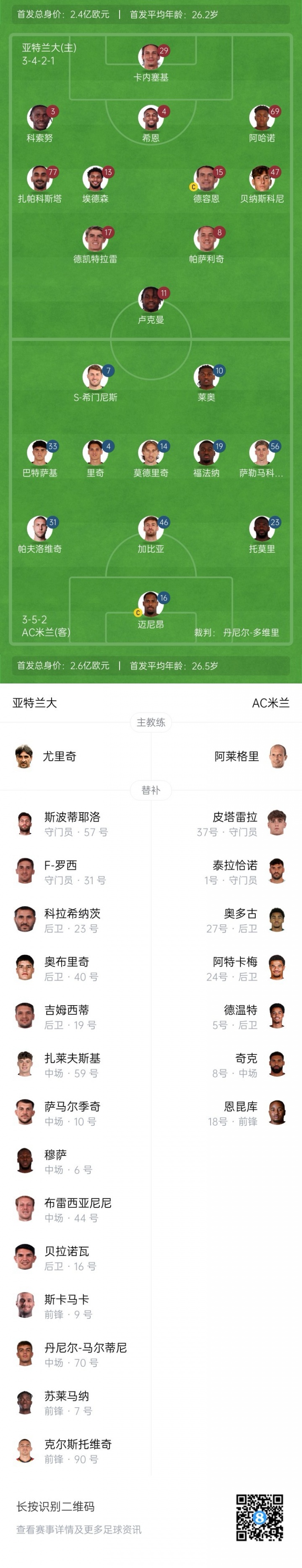 亚特兰大替补:57-斯波蒂耶洛、31-F·罗西、23-克拉西纳茨、40-奥布里奇、19-吉姆西蒂、59-扎莱夫斯基、10-萨马尔季奇、6-穆萨、44-布雷夏尼尼、16-贝拉诺瓦、9-斯卡马卡、70-丹尼尔·马尔蒂尼、7-苏莱马纳、90-克尔斯托维奇