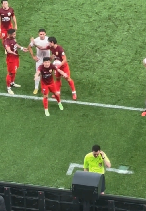 裁判在查看VAR时,海港和蓉城球员在场边围观,武磊还向裁判喊话,试图交流。