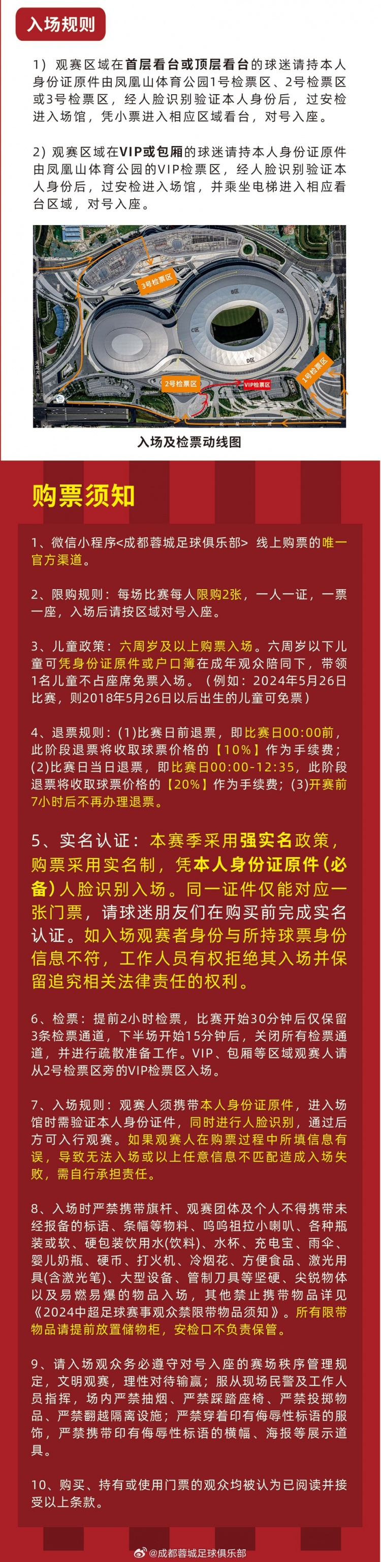 今天14:00,成都蓉城vs青岛西海岸主场比赛球票线上开售,请各位球迷朋友定好闹钟!线上购票相关购买须知、优惠群体政策、进场及检票方式等信息请通过图片详情了解!