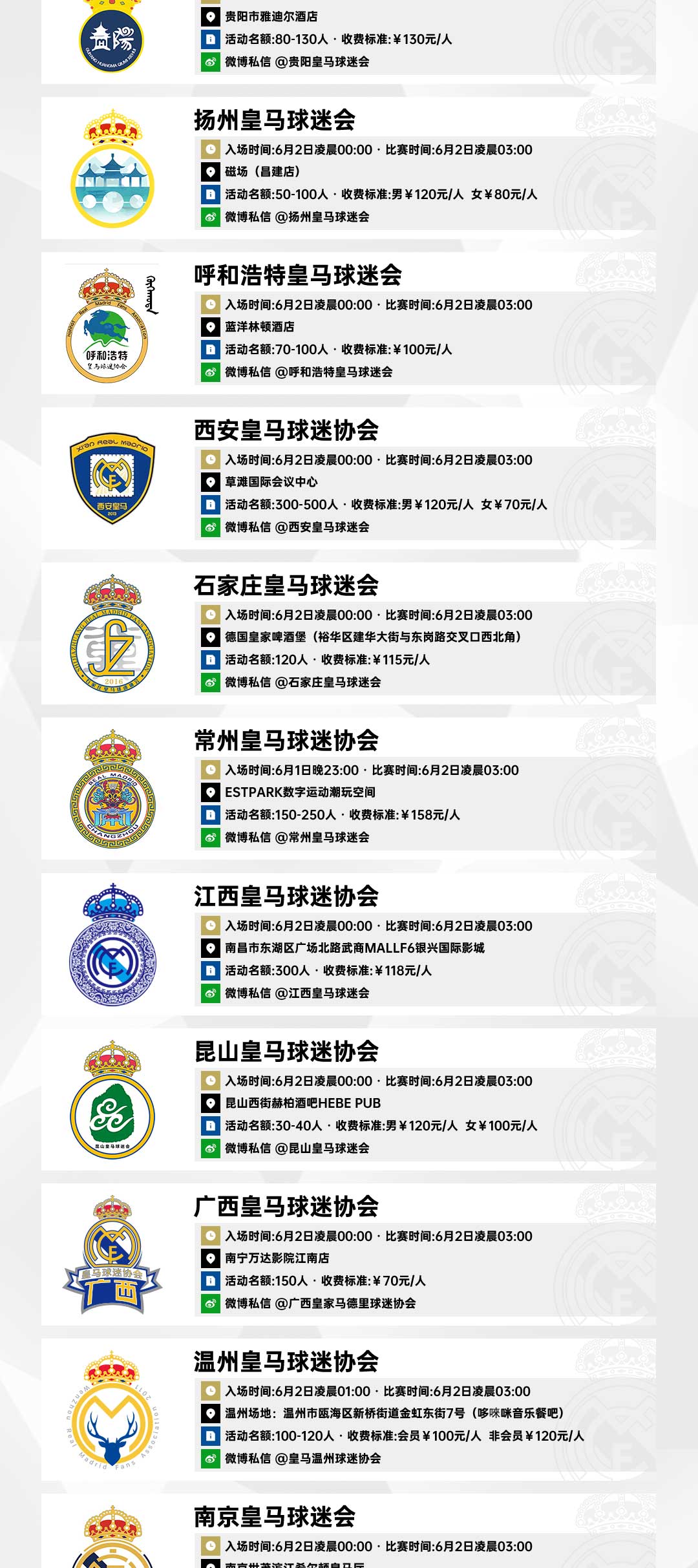 这是所有皇马球迷的节日,值此决赛之际,中国皇马球迷协会官方也正式入驻。中国皇马球迷协会也带来了决赛观赛活动的消息,届时各地皇马球迷会将会在全球40座城市举办欧冠决赛观赛夜活动。也将作为合作媒体和赞助伙伴参与本次活动。