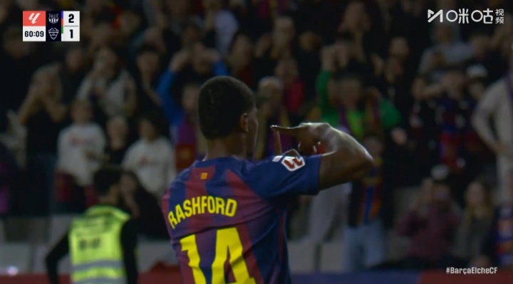 11月03日讯 西甲第11轮,巴萨vs埃尔切。比赛第60分钟,费尔明长传送出助攻,拉什福德晃过防守球员后左脚劲射,足球爆杆入网!