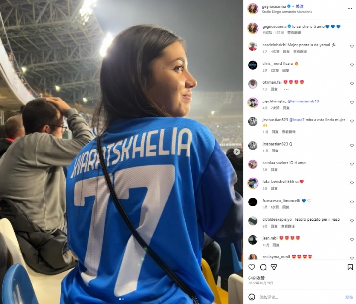 在格鲁吉亚球星科瓦拉茨赫利亚上赛季冬窗转会巴黎前,Anna还曾在社媒晒出自己身穿K77的球衣现场观看那不勒斯比赛的照片,并配文道:“你知道我爱你”。