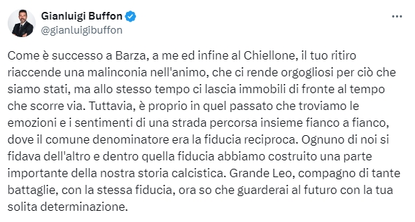 布冯写道:“正如曾发生在巴尔扎利、我和基耶利尼身上的一样,你的退役带给我们灵魂以忧伤,这一情感令我们为曾经的自己感到骄傲,同时也让我们在觉察时间流逝后停滞不前。然而正是在那段过往中,我们共享某些感觉与情绪,并肩走过一段旅程,相互信任。我们每个人都相信彼此,正因这份信任,我们在足球史上留下重要一笔。伟大的Leo(莱昂纳多),我并肩作战的伙伴,带着这份自信,我知道你会以一贯的决心展望未来。”