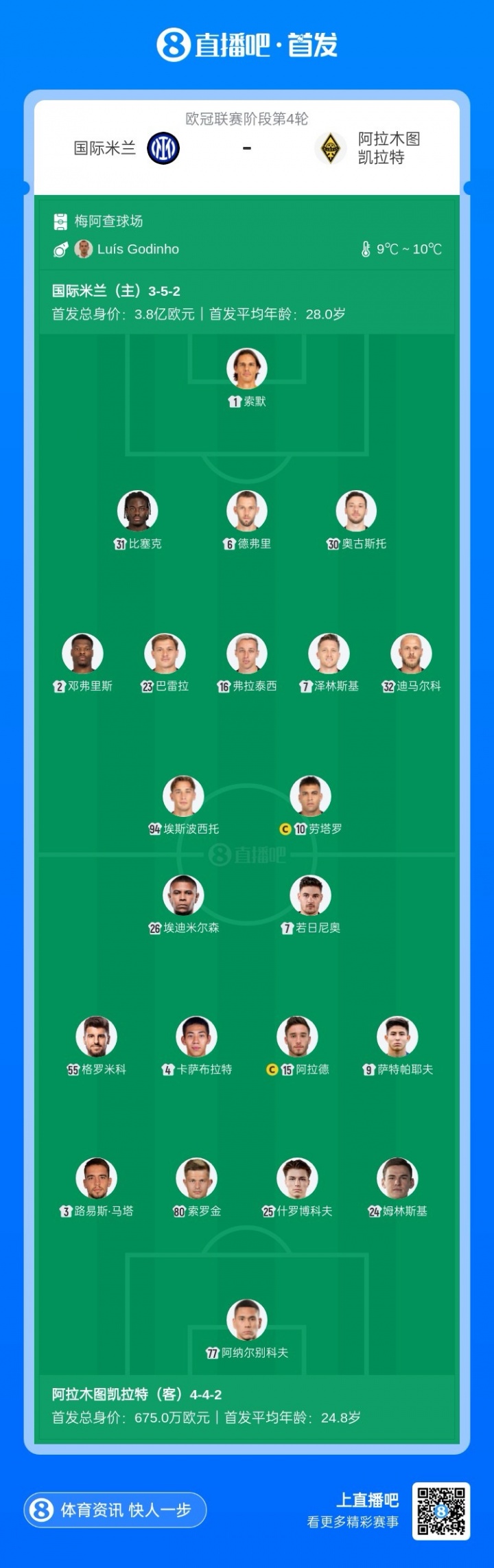 11月6日讯 欧冠第4轮,国米主场迎战阿拉木图凯拉特比赛即将打响。赛前首发出炉。