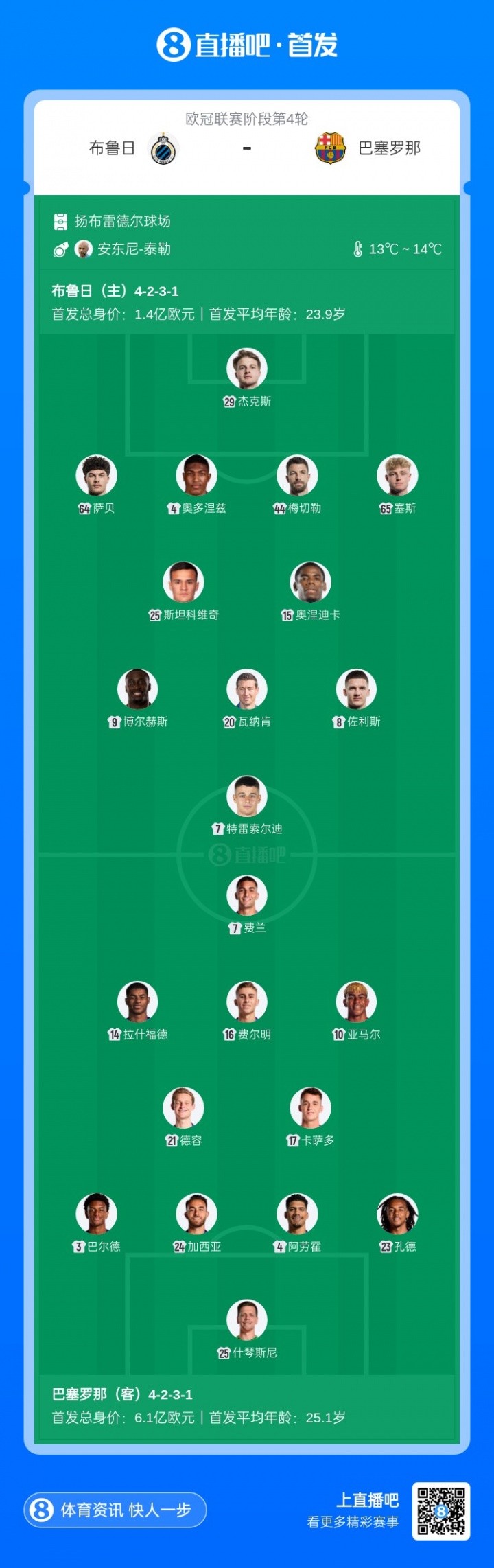 11月6日讯 北京时间11月6日4:00,欧冠第4轮,布鲁日vs巴萨。赛前双方公布了首发名单。【巴萨方面,延续了拉什福德-费兰-亚马尔三叉戟,中场位置卡萨多搭档德容组成后腰组合,此前伤愈的莱万、奥尔莫本场继续替补待命。】