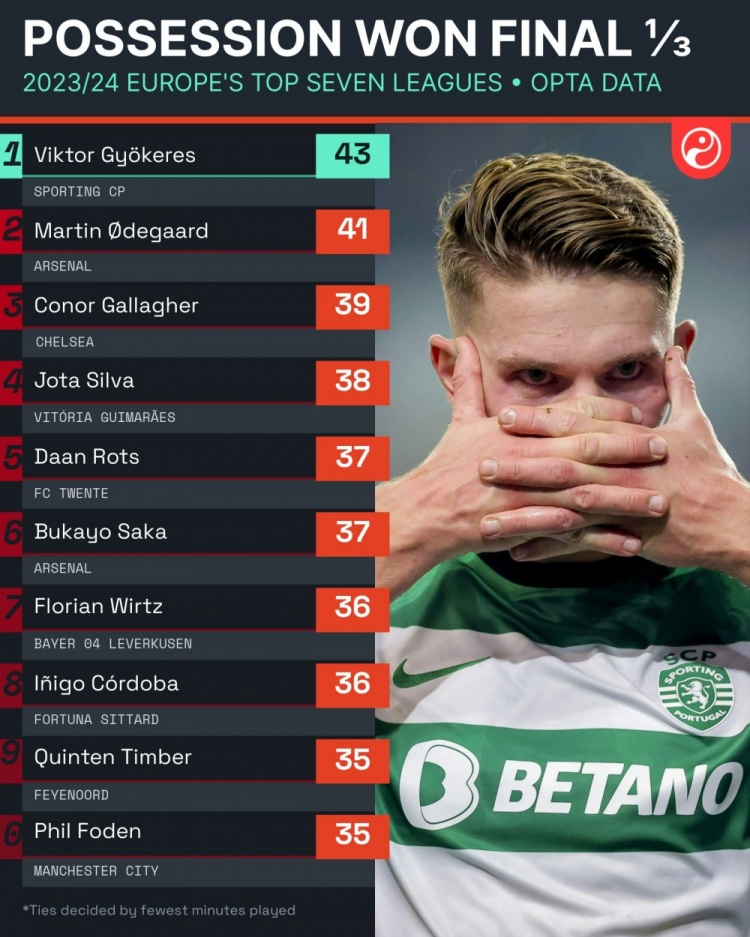 前7联赛进攻三区夺得球权榜:约克雷斯、厄德高、加拉格尔前三