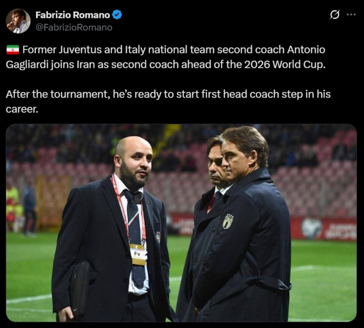 11月8日讯 罗马诺报道,前尤文、意大利国家队助理教练加利亚尔迪(上图图左)加入伊朗国家队教练组,担任助理教练,备战2026年世界杯。