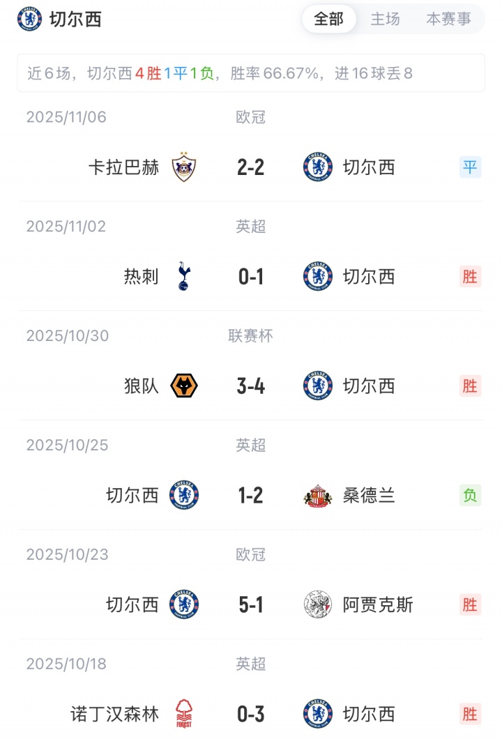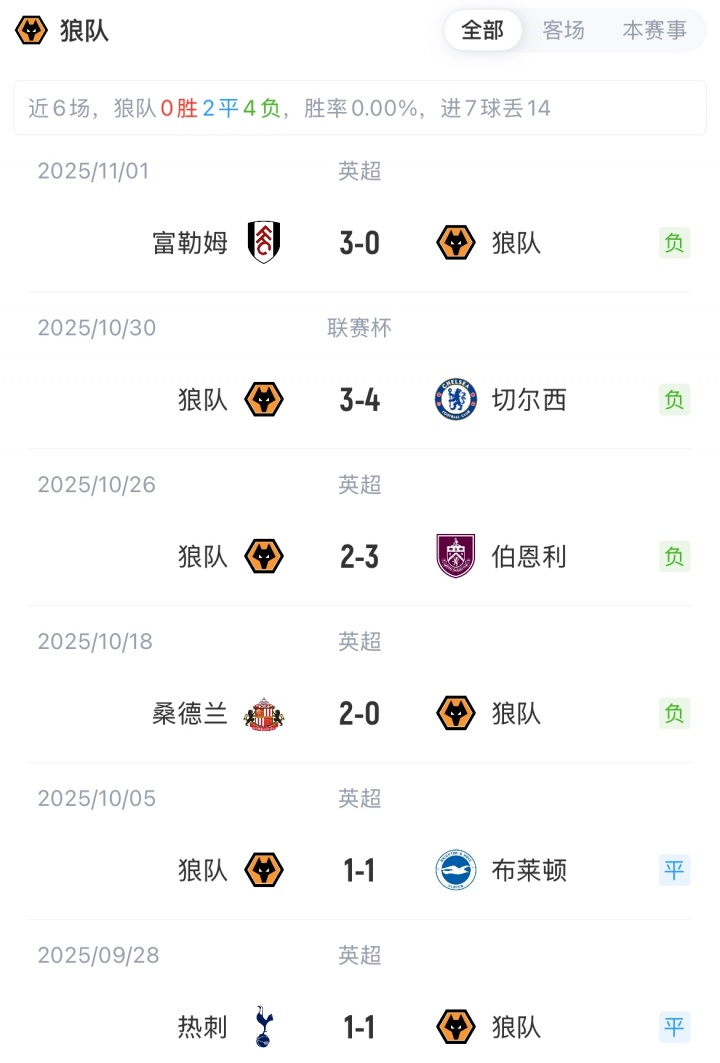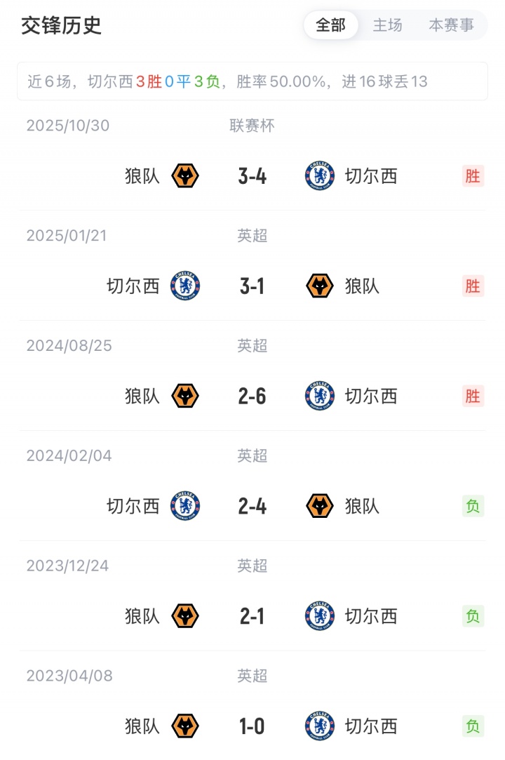 切尔西目前5胜2平3负,暂以17分排名第八。狼队0胜2平8负,以2分排名垫底。