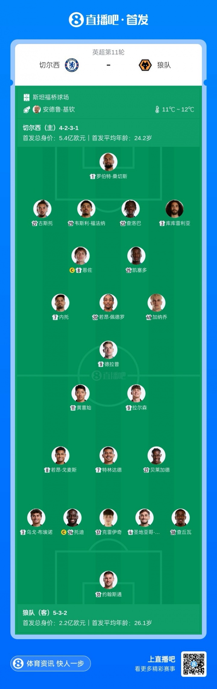 11月9日讯 英超第11轮,切尔西对阵狼队,赛前首发公布。