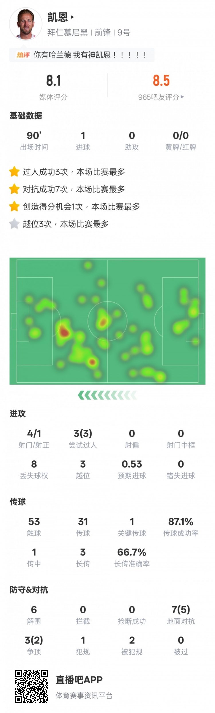 11月9日讯 2025-26赛季德甲第10轮,拜仁客场2-2柏林联合。凯恩首发出战,打进绝平进球,送出1次关键传球,3次过人成功,还有6次解围,评分8.1。