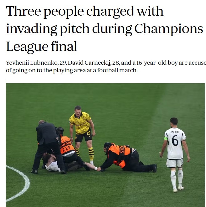 报道称,这三名球迷分别是29岁的Yevhenii Lubnenko、28岁的David Carneckij和一名未透露姓名的16岁男孩,这三人被指控违反相关条例进入到比赛场地内。