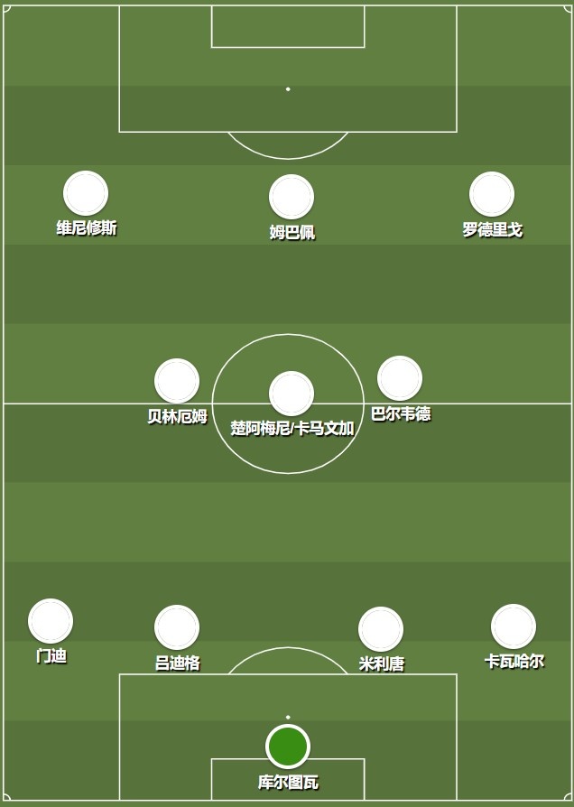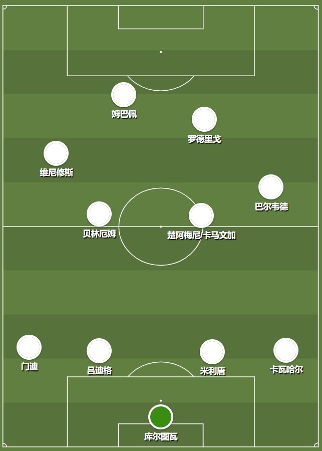 还有一种可能就是踢4-4-2阵型,贝林厄姆和楚阿梅尼组成双中场,维尼修斯和巴尔韦德出任左右两边前卫,姆巴佩和罗德里戈搭档双前锋,防守时罗德里戈回撤到中场,切换为4-5-1阵型。